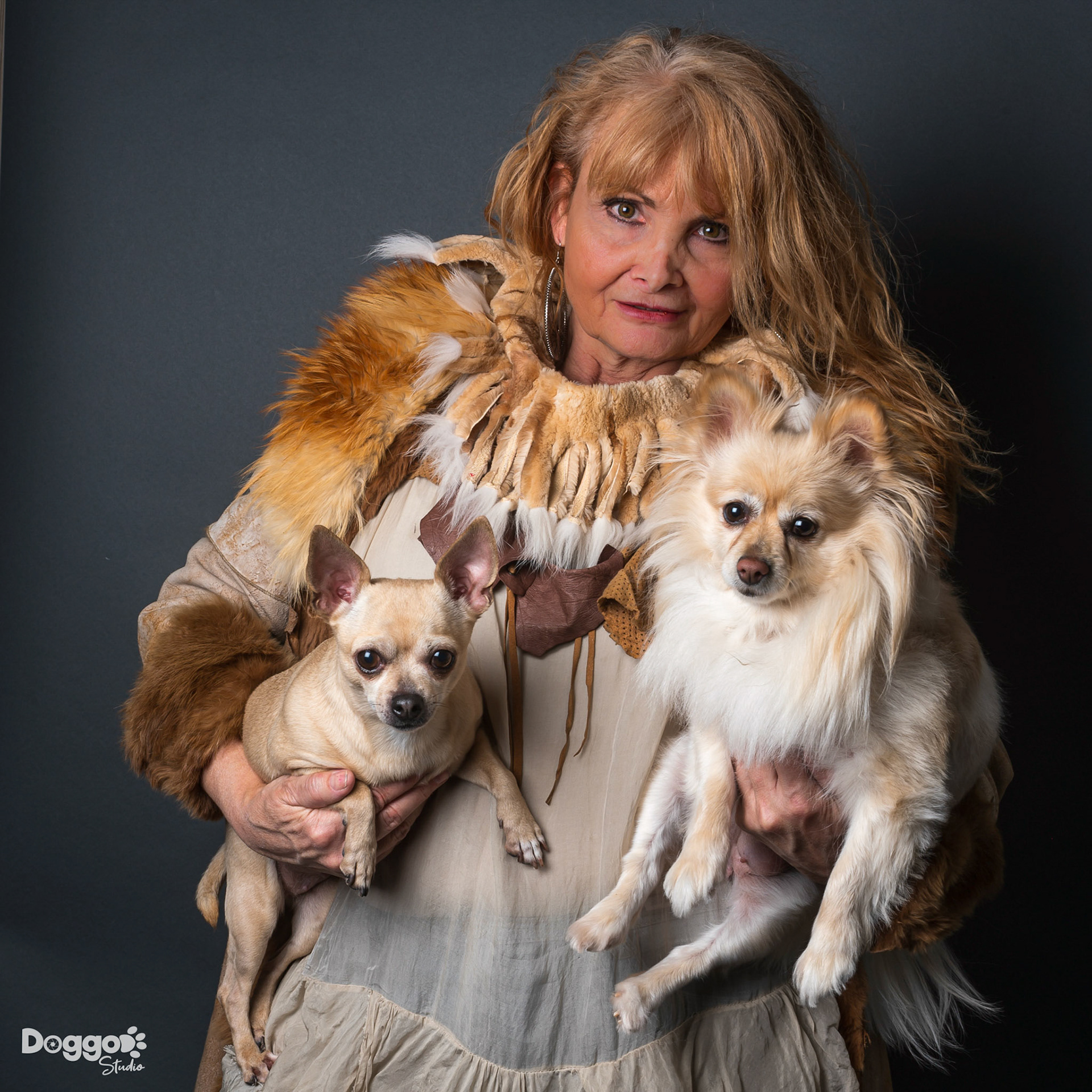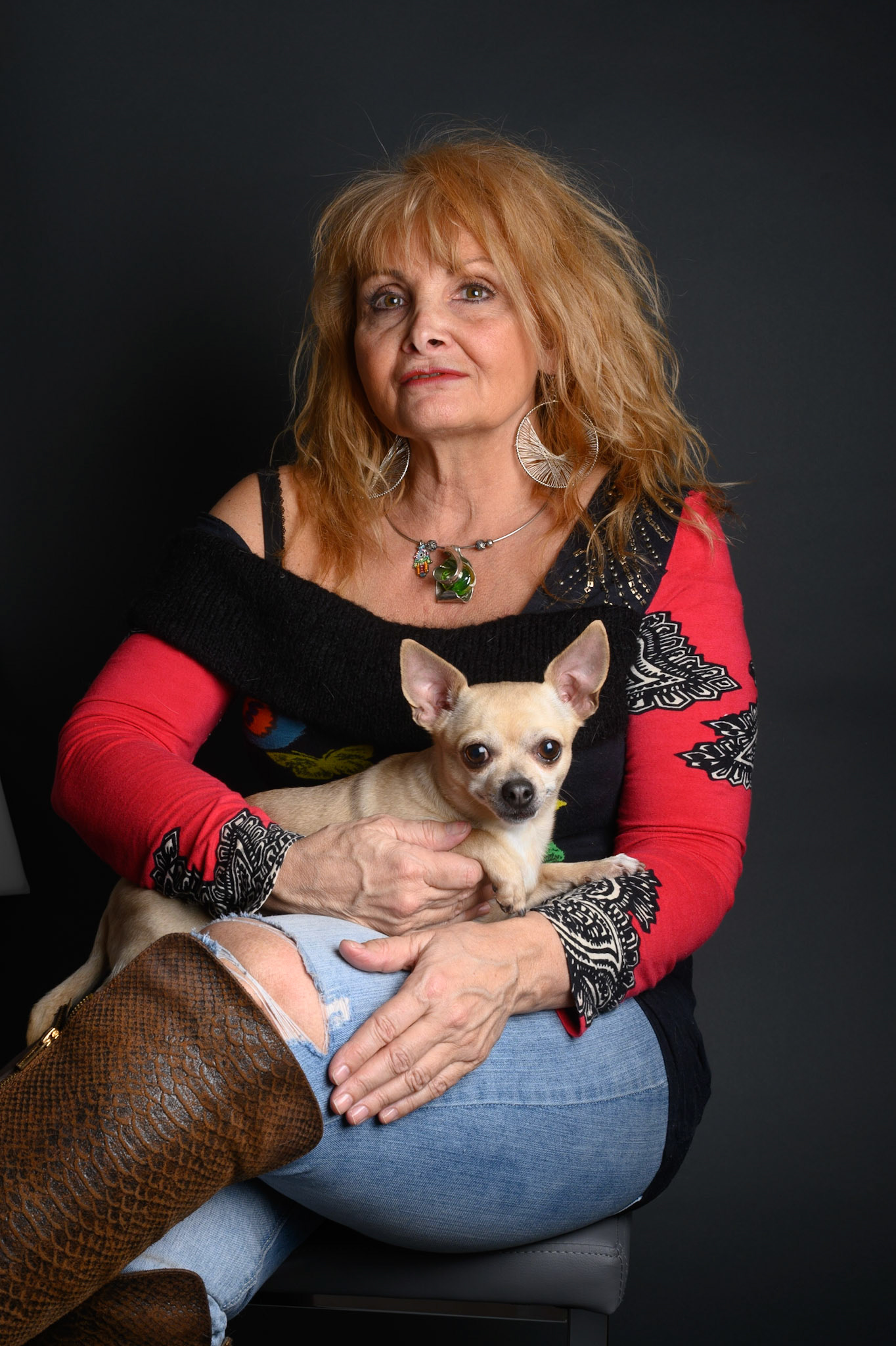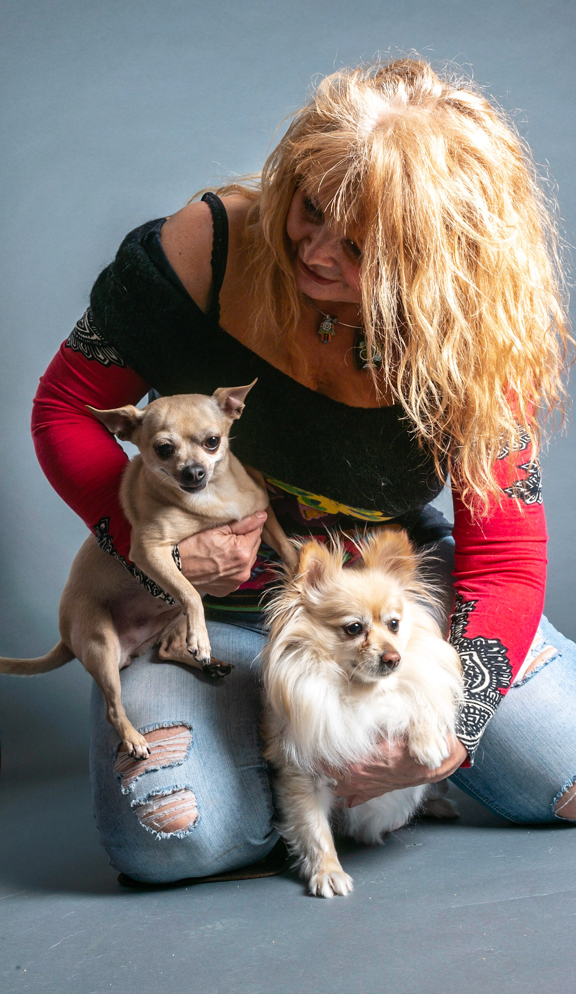 Sylvie et ses deux jolies petites chiennes : la poméranéenne Prada et la chihuahua Virgule.