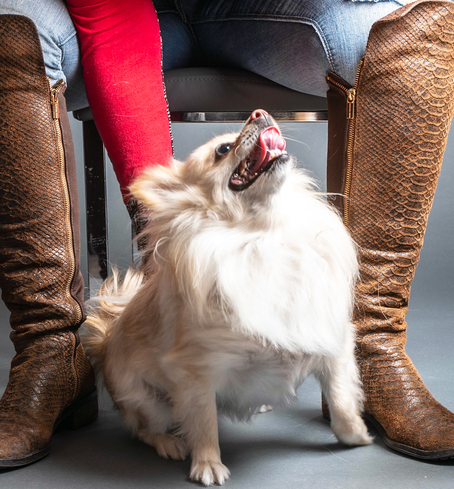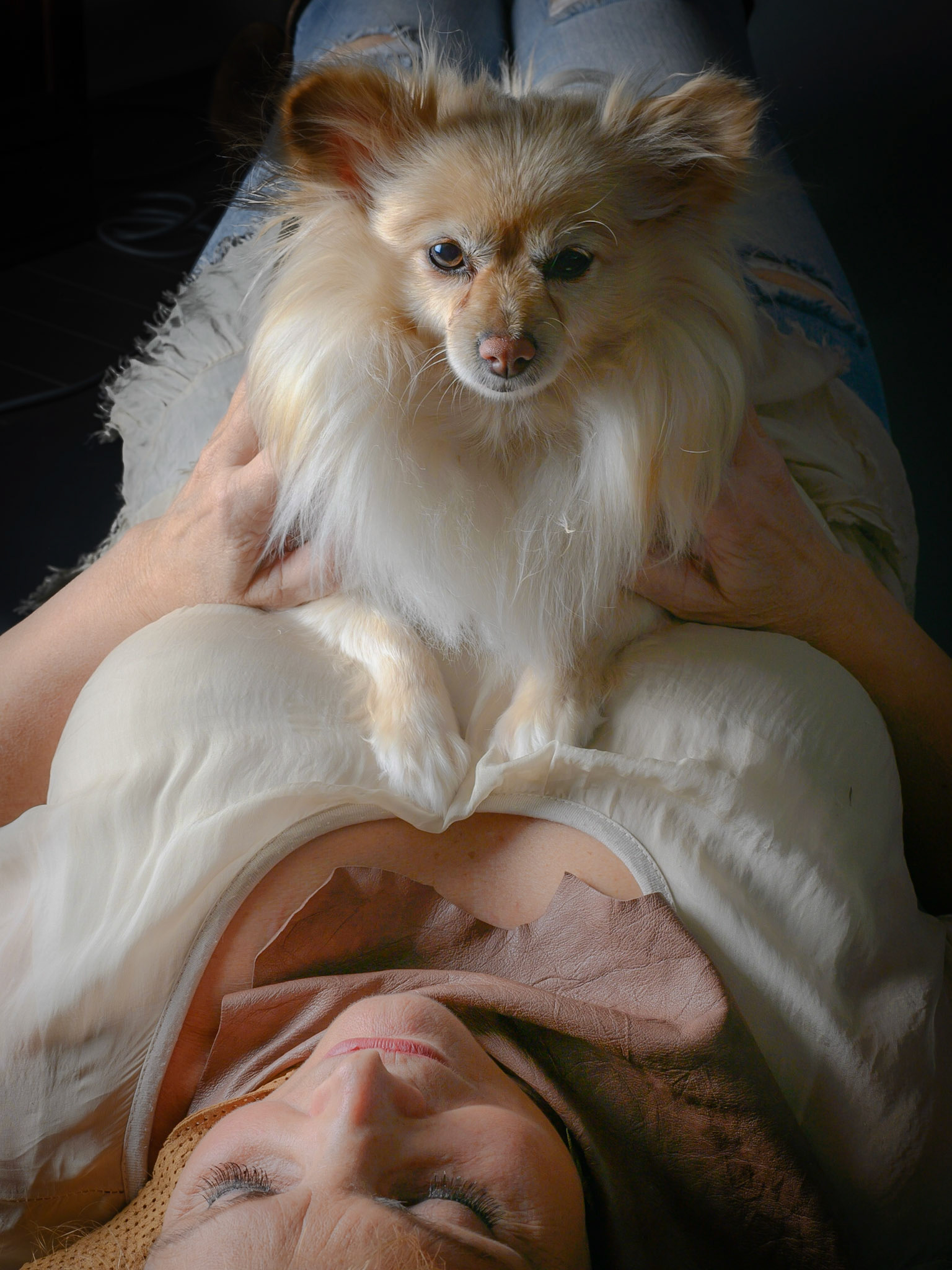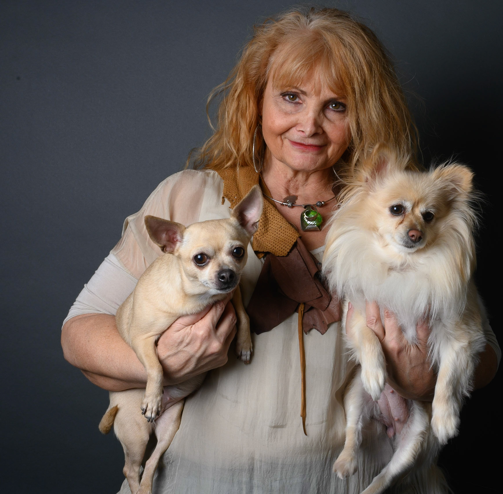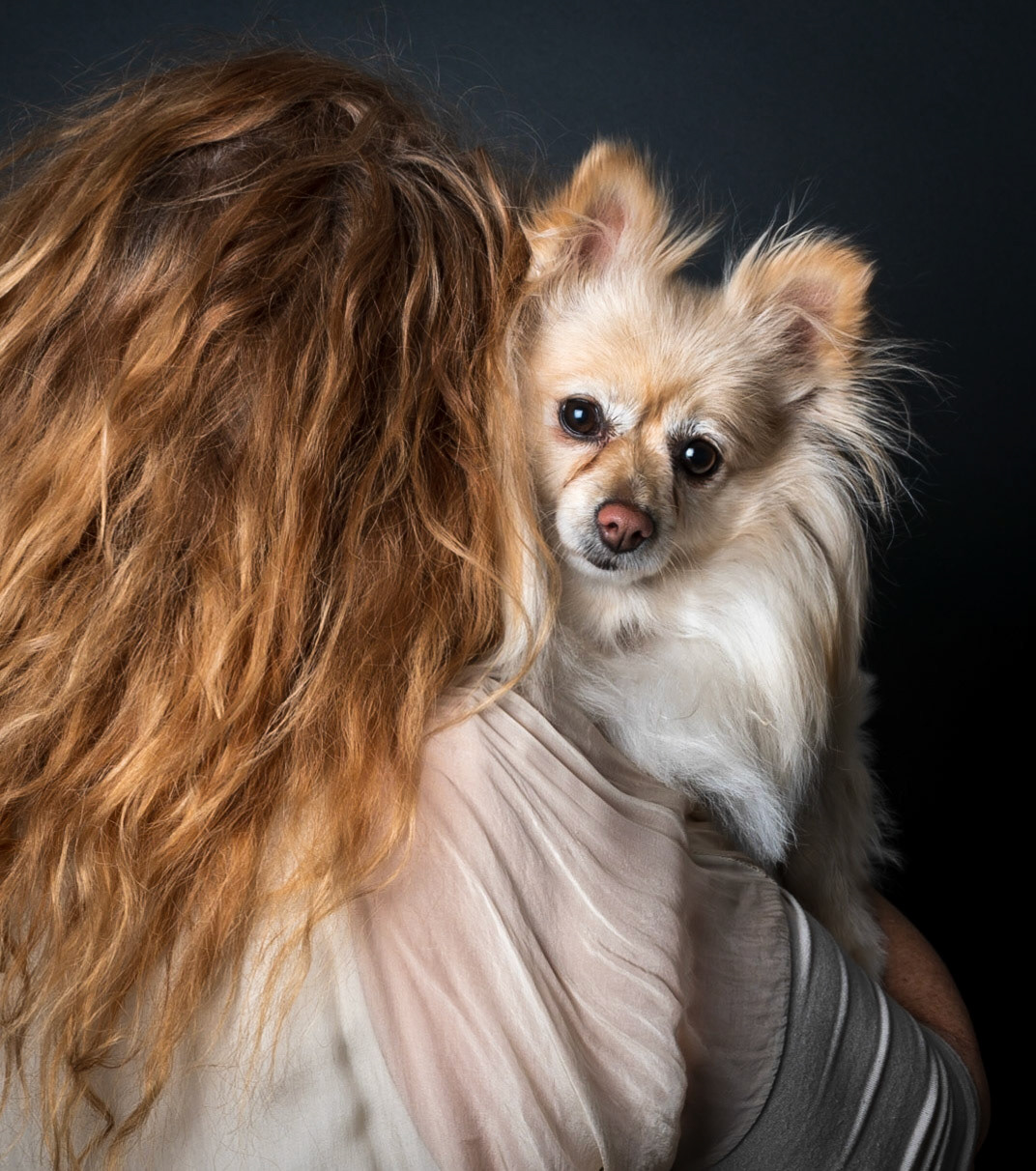 Sylvie et ses deux jolies petites chiennes : la poméranéenne Prada et la chihuahua Virgule.
