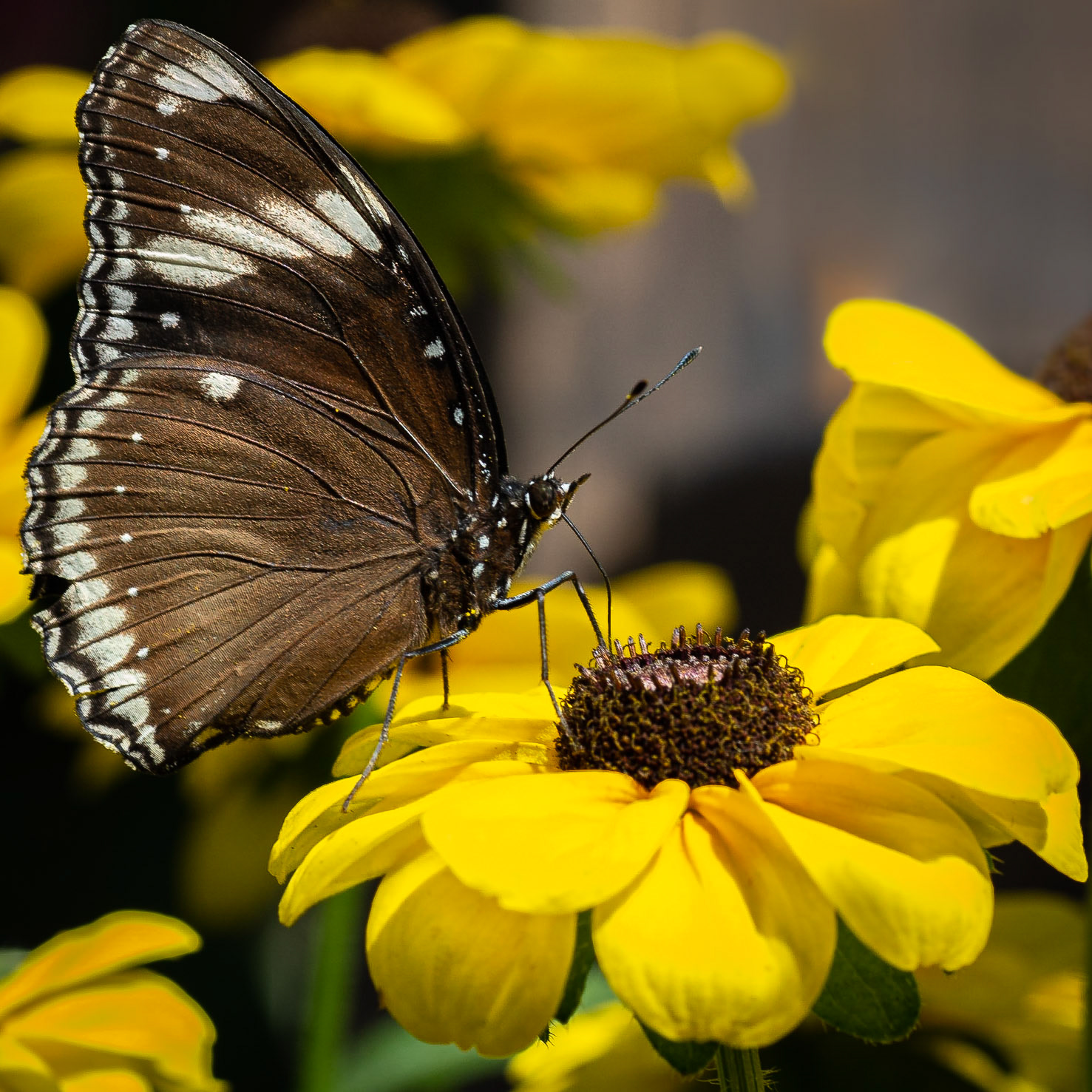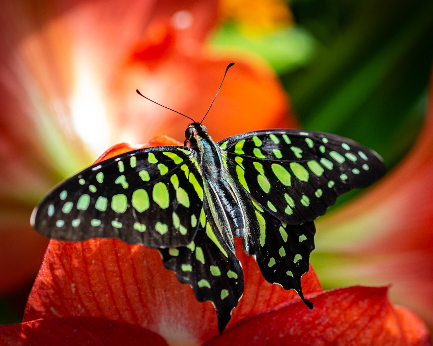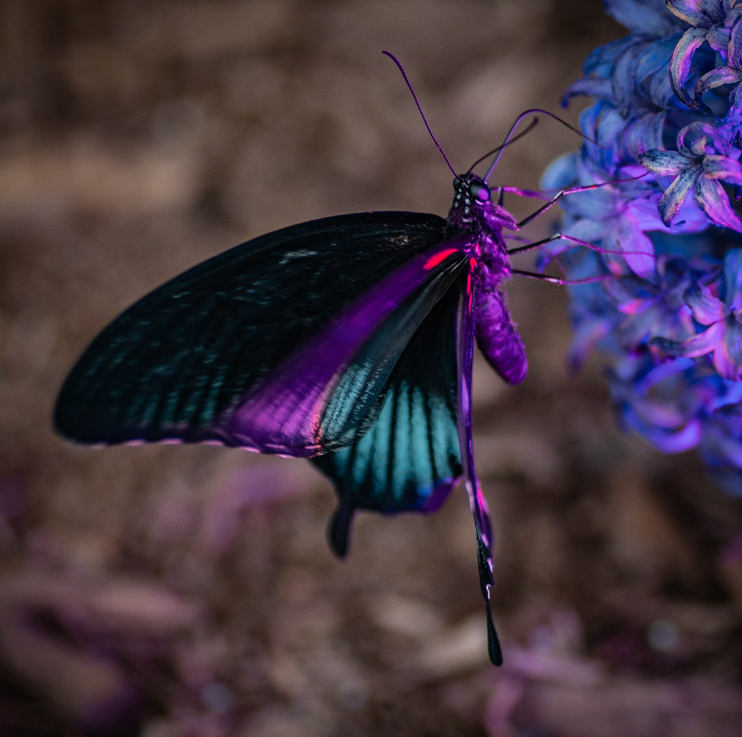 A black and blue butterfly on a multicolored background